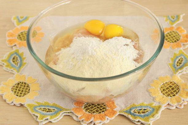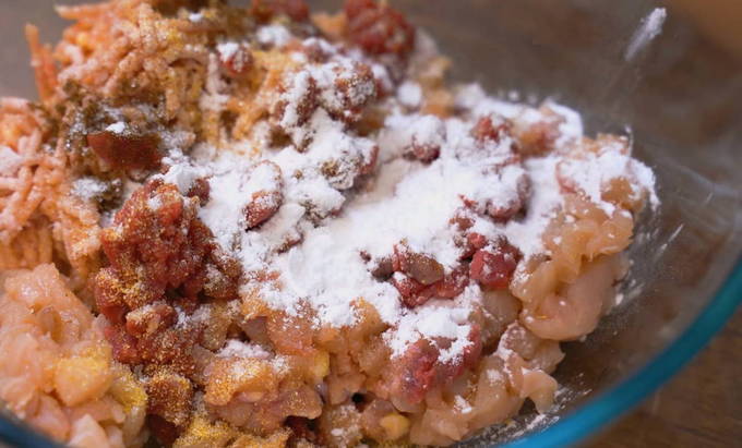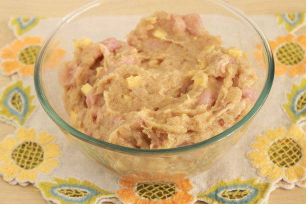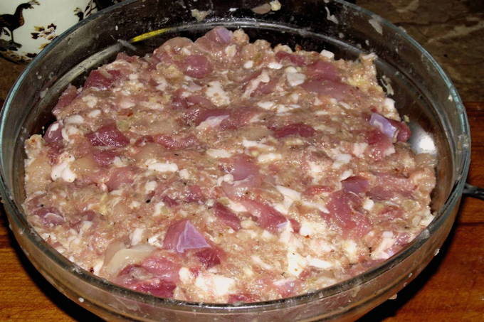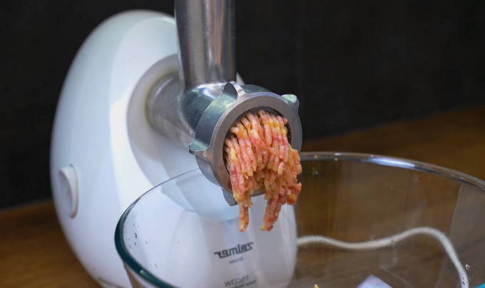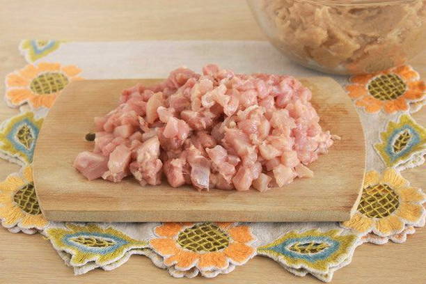 - Maal kippendijen met een vleesmolen, leg een dij opzij. Gerookt mager spek kan voor de smaak aan het gehakt worden toegevoegd.
