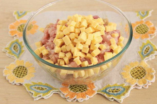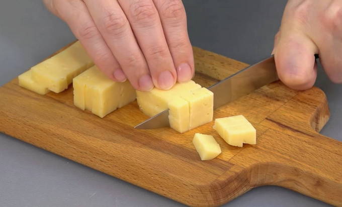 - We snijden de harde kaas in kleine blokjes voor een gemakkelijke integratie in het gehakt.
