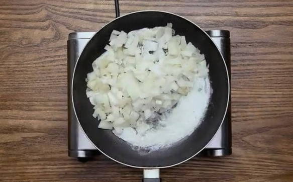 - In een met boter voorverwarmde koekenpan de gesnipperde uien goudbruin bakken.