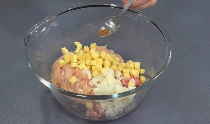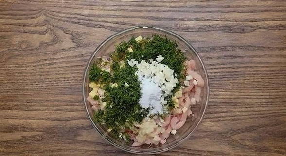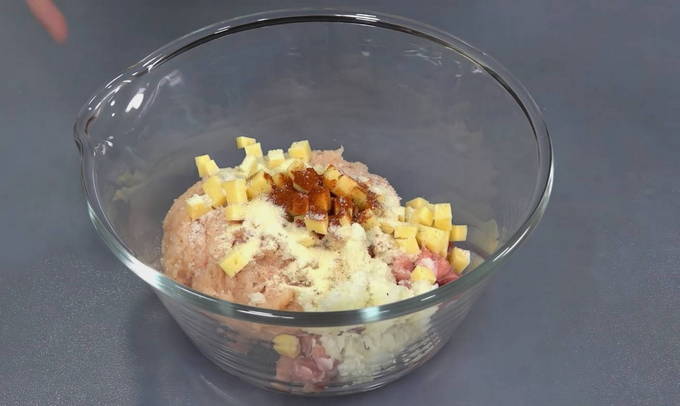 - Meng het gehakt met uien, breng op smaak met knoflook, zwarte peper en zout. We sturen de kaas in kleine stukjes gesneden in dezelfde container. Maal een bosje dille om kleur en smaak toe te voegen.Om sappig gehakt te krijgen, moet je een beetje water toevoegen. We malen alle ingrediënten zorgvuldig door elkaar.