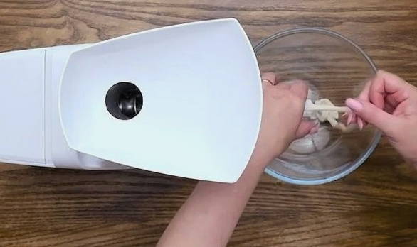 - Tegelijkertijd door een vleesmolen stukjes kipfilet halen en combineren met geweekte uien.