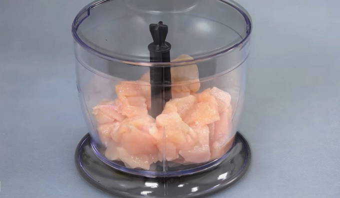 - We sturen de kipfilet naar een blender, nadat we hem eerder in kleine blokjes hebben gesneden. Ook kan vlees worden gehakt met een vleesmolen.