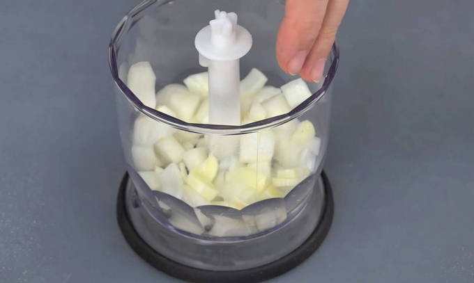 - Voor het gemak en de snelheid sturen we gepelde uien met een teentje knoflook om in een blenderkom te worden gehakt.