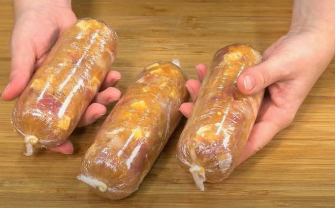 - Voor het vormen van worsten gebruiken we traditioneel huishoudfolie, waarin we gehakt verpakken. Om de worst dicht te maken, knijp je overtollige lucht eruit en draai je hem goed. Om de uiteinden van de gevormde worst vast te zetten, moeten we hem vastbinden, dit voorkomt dat hij uit elkaar valt.
