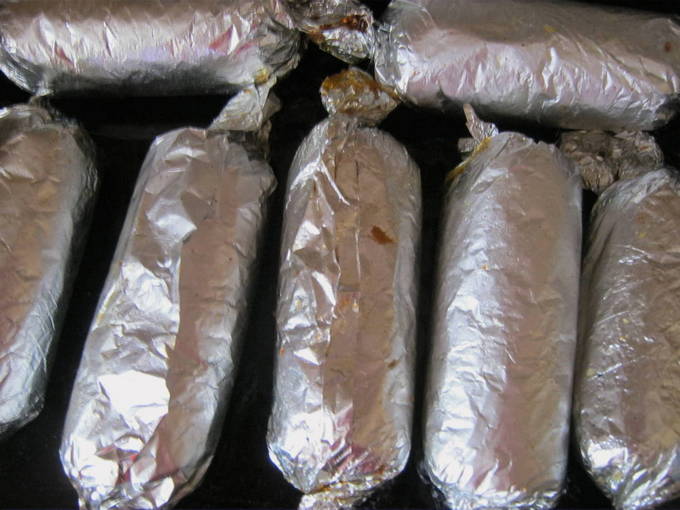 - Leg de in folie gewikkelde worstjes op een bakplaat en stuur ze naar de voorverwarmde oven op 200 graden. We stoppen 60 minuten en genieten van de aroma's die uit de keuken komen.