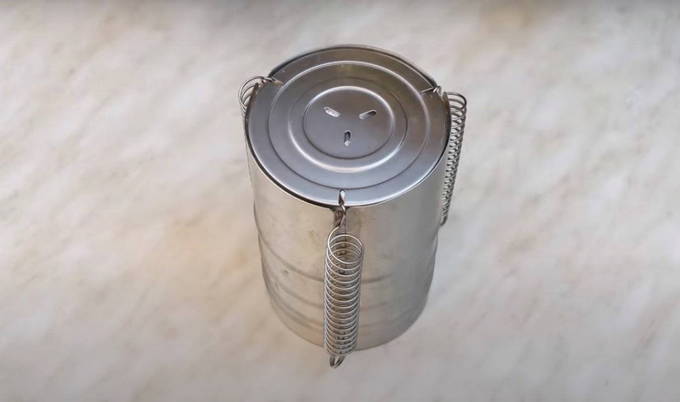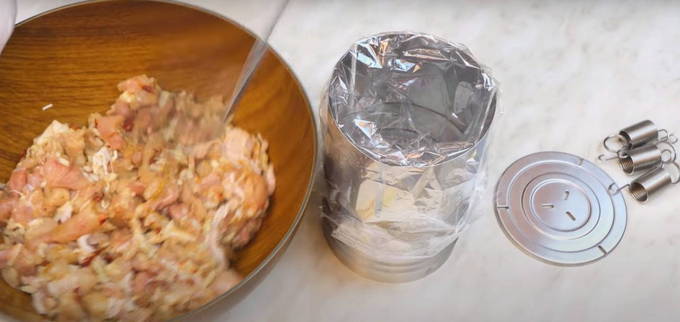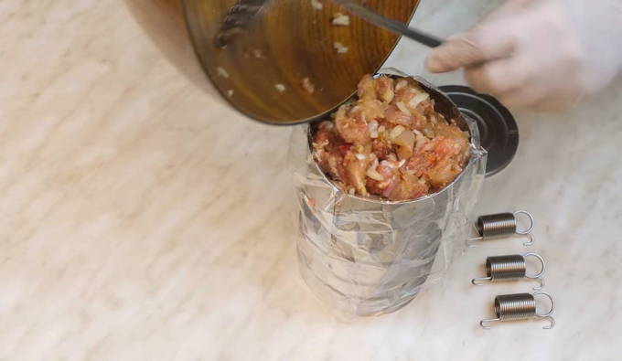 - We vullen de voorbereide vorm met gehakt, zorg ervoor dat je het aanstampt zodat er geen gaten zijn. Deze hoeveelheid voer is voldoende voor 1 kg ham. We binden het vrije uiteinde van de zak en bedekken met een deksel, waarbij we de veren aan de zijkanten installeren.