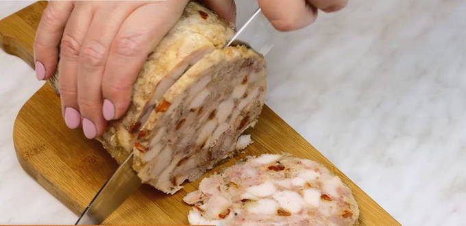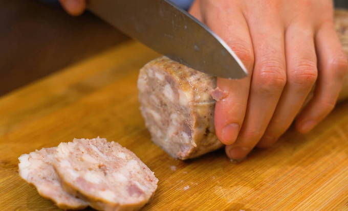 Gedurende deze tijd is de gelatine uitgehard en kan de worst al gemakkelijk van de wanden van de fles worden gescheiden. Voel je vrij om te snijden en te serveren.
