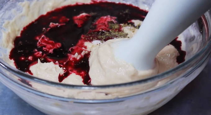 - Voeg voor een mooie natuurlijke kleur bietensap toe tot een homogene massa en breng op smaak met kruiden. U kunt elke gebruiken, op basis van uw smaakvoorkeuren.