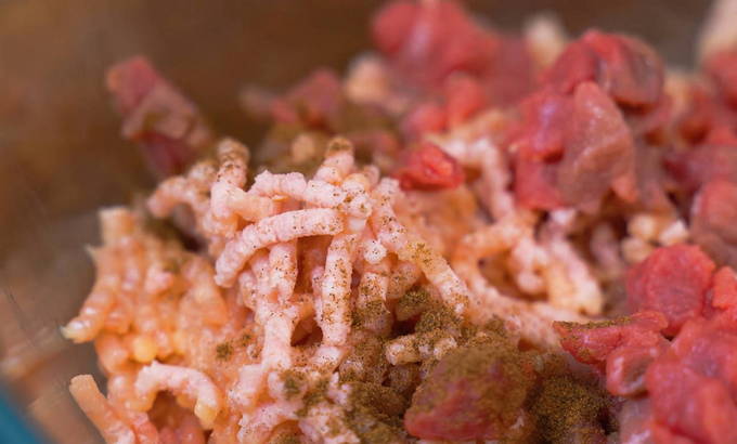 - Snijd om te beginnen het vlees met reuzel in kleine stukjes en combineer in één bak.