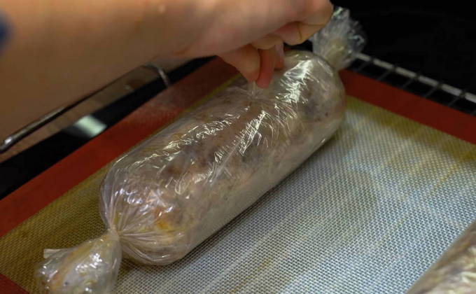 - Afhankelijk van hoe dik we de worst willen, rollen we de vershoudfolie in minimaal 6 lagen zodat deze niet uiteenvalt tijdens het kookproces. Het is beter om knopen aan de uiteinden te leggen en vast te zetten met draad.
