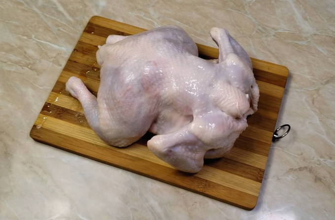 We wassen de kip goed, snijden hem in afzonderlijke delen.