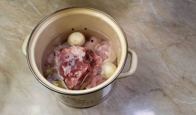 Zout onmiddellijk, voeg piment, hele uien, laurierblaadjes en een stuk varkensvlees toe. Vul alle inhoud met koud water en stuur ze naar het vuur net onder het gemiddelde. Kook met het deksel open gedurende 40 minuten.