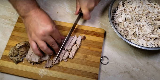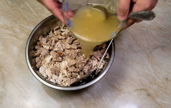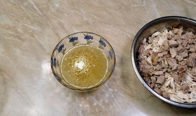 Daarna brengen we al het vlees over in een aparte container en laten we het afkoelen. Zodra het vlees is afgekoeld, moet het worden versneden, waarbij alle onnodige botten worden verwijderd.