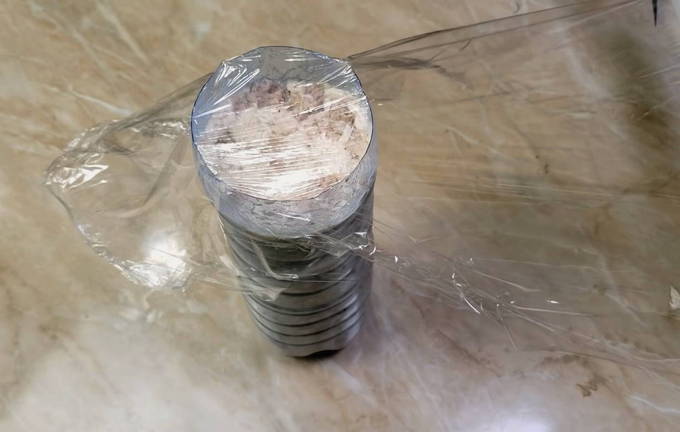 - We wikkelen de gevormde worst in huishoudfolie voor betrouwbaarheid in plastic zakken. Hetzelfde doen we met het tweede deel van het gehakt.