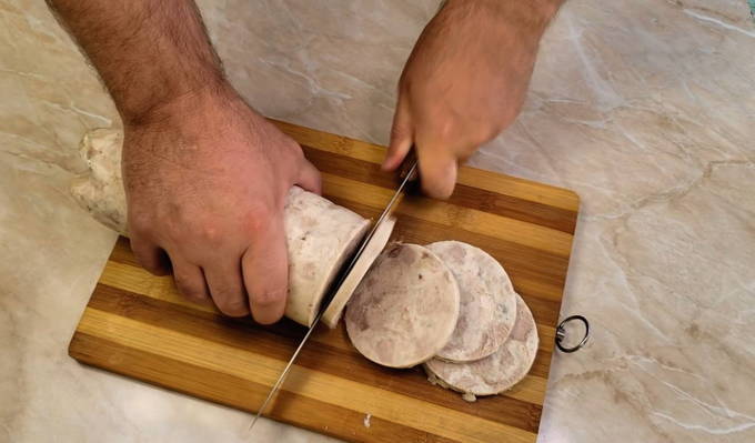 - We halen de gebakken worstjes eruit en laten ze afkoelen op kamertemperatuur. Daarna halen we het uit de hoes en snijden het voorzichtig op de gewenste dikte.
