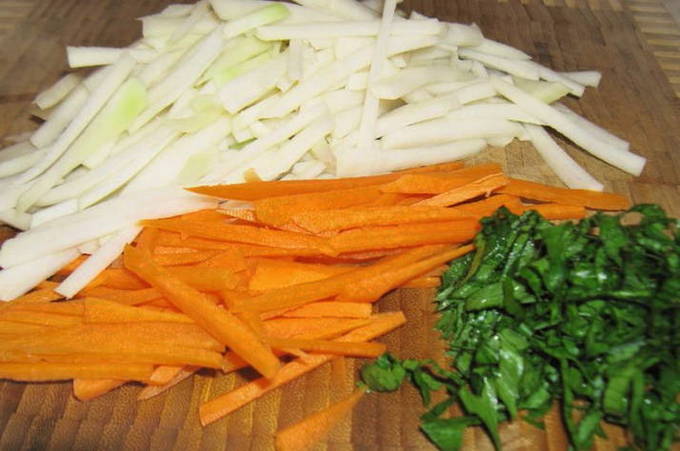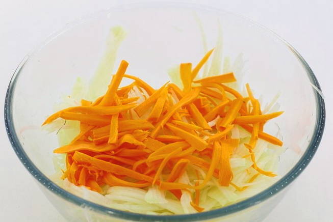 - Schil en snijd de koolrabi en wortel in dunne reepjes.