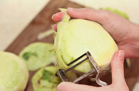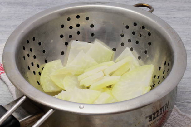 - Kook 300 milliliter water in een pan, dompel de koolrabi erin en giet de azijn erbij, kook 10-12 minuten.