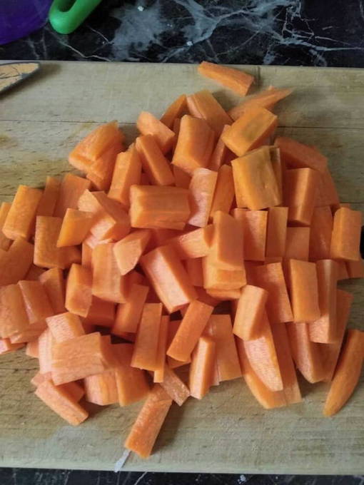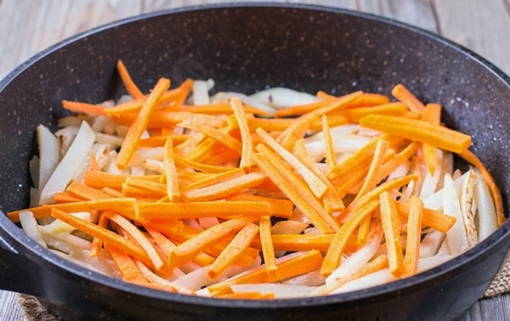 - Voeg de wortelen toe aan de pan en kook nog 3-4 minuten, af en toe roeren.
