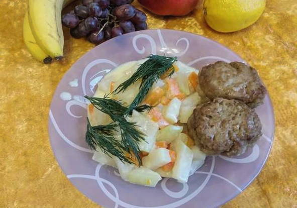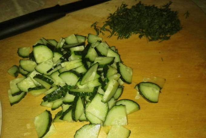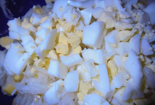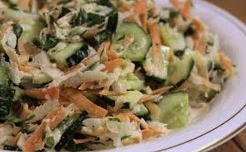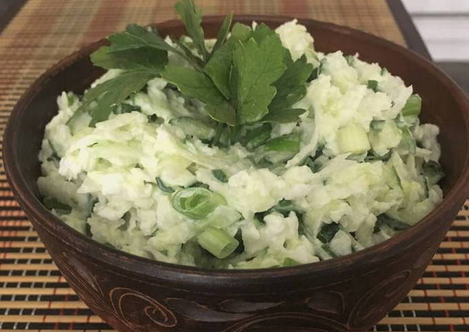 - Combineer de gehakte ingrediënten, voeg zout toe en breng op smaak met mayonaise. De salade is klaar, je kunt hem op tafel serveren.