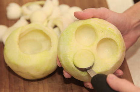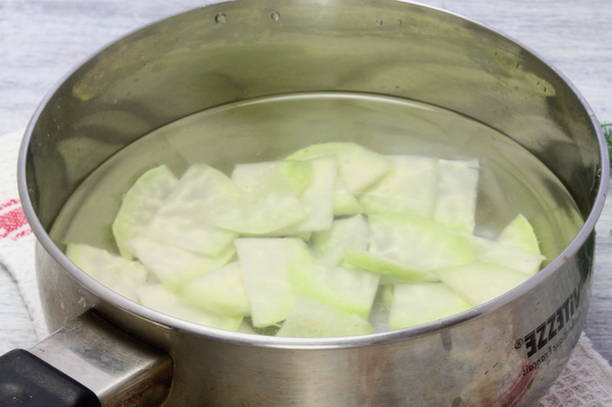 - Snijd vervolgens voorzichtig de koolrabipulp uit en laat de wanden 7-10 millimeter breed. Blancheer de resulterende "kopjes" 7-10 minuten in kokend water.