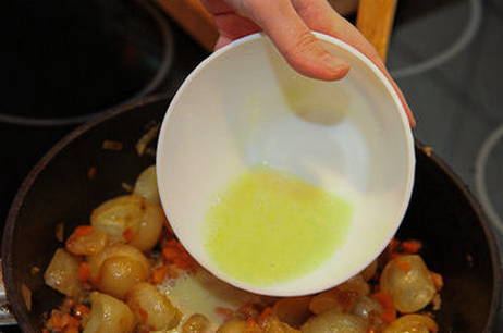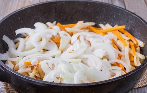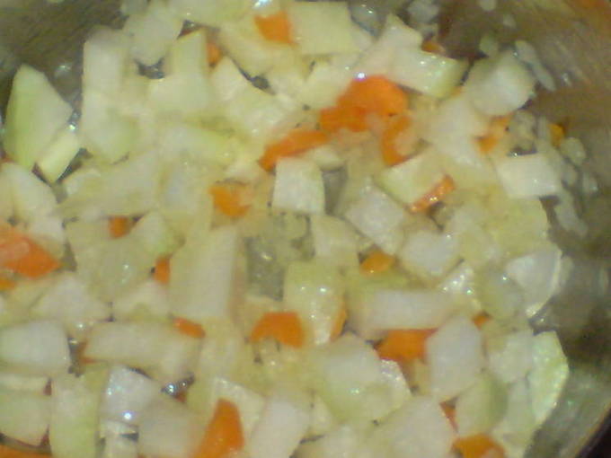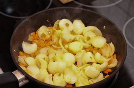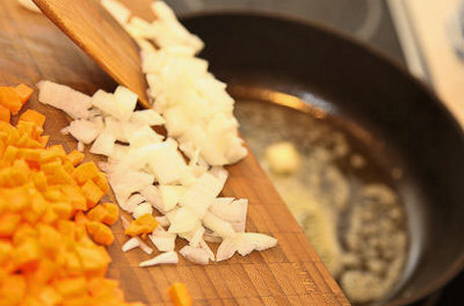 - Snijd de uien en wortelen fijn en bak ze in boter tot ze zacht zijn.