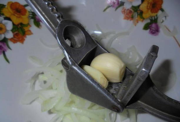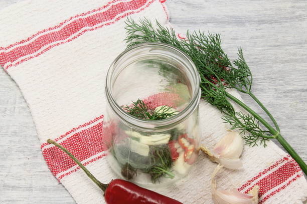 - Was en steriliseer de beitspot goed. Leg de knoflook, dille en chili op de bodem.