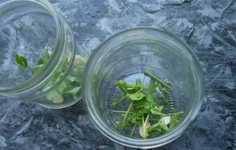 - Was en steriliseer naadpotten. Leg op de bodem van elke pot een takje bleekselderij, een paar erwten en gepelde knoflookteentjes.