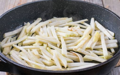 - Zet de pan in brand, giet er plantaardige olie in. Leg vervolgens de koolrabi neer en bak deze 1-2 minuten op hoog vuur. Zet dan het vuur lager en kook de kool nog 5-6 minuten, roer de koolrabi heel voorzichtig om.