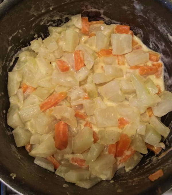 - Leg vervolgens de wortels neer, blijf 3-4 minuten koken. Voeg vervolgens koolrabi toe, giet melk erbij, voeg bloem toe, roer en breng aan de kook.