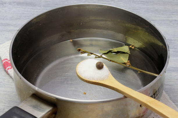 - Maak ook de marinade klaar. Breng in een pan 200-250 ml water aan de kook, voeg zout, suiker en kruiden toe. Nadat de suiker en het zout volledig zijn opgelost, voeg je de azijn toe, roer je en haal je de marinade van het vuur.