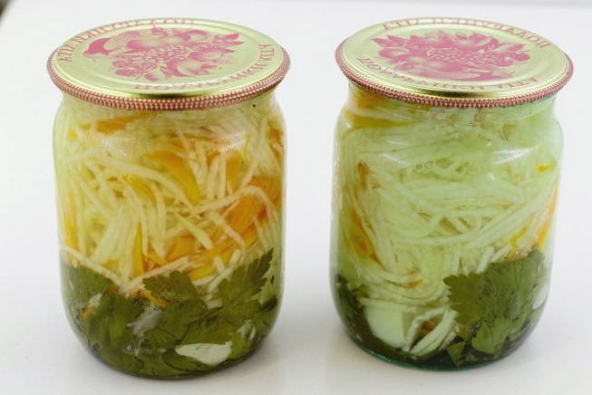 - Bedek de blanco's met deksels en plaats ze in een pan met kokend water. Steriliseer de potten gedurende 20-25 minuten. Rol vervolgens de deksels op de blikken, wikkel ze in een deken en laat volledig afkoelen. Bewaar koolrabisalade op een koele plaats.