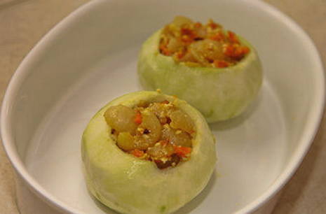- Vul koolrabiblikken met groentefrietjes en plaats ze in een ovenvaste schaal. Giet een glas water in de vorm en plaats deze in de oven, voorverwarmd tot 180 graden.