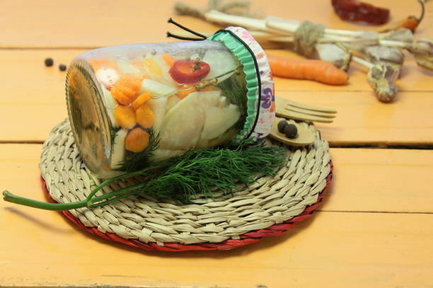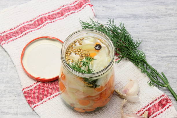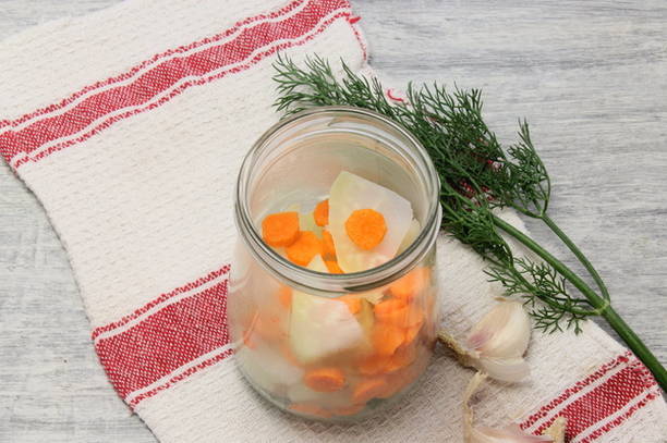 - Doe vervolgens het mengsel van koolrabi en wortel in de potten. Kook de benodigde hoeveelheid water in een pan, voeg zout en suiker toe, roer tot ze volledig zijn opgelost. Giet vervolgens de azijn erbij, breng de marinade aan de kook en haal van het vuur. Giet de hete marinade in de potten.