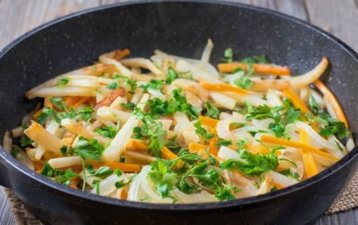 Koolrabi gebakken in een pan kan worden geserveerd als bijgerecht bij verschillende vlees- en visgerechten. Dit koolrabigerecht kan een caloriearm alternatief zijn voor gebakken aardappelen.