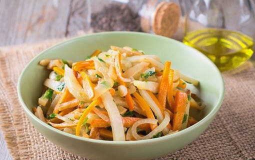 Heerlijke en sappige koolrabi is een uitstekende basis voor groentesalades. Het past goed bij veel soorten groenten. We maken een heerlijke salade van koolrabi, komkommer en wortel.