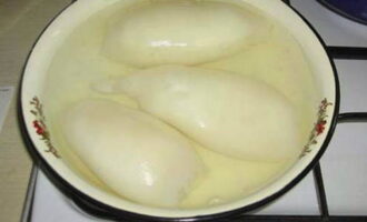 - Ontdooi de inktviskarkassen volledig, overgiet met kokend water en verwijder de film.