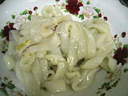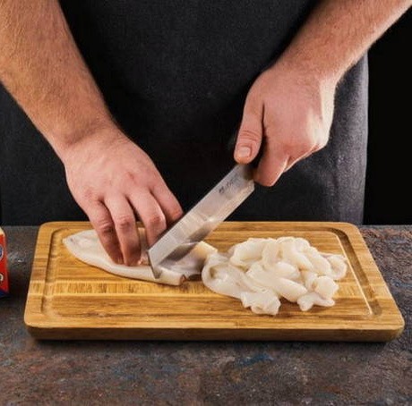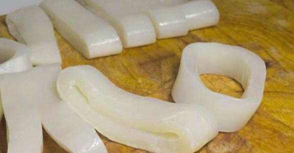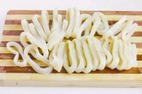 - Snijd de inktvis in ringen van 1-1,5 centimeter breed.