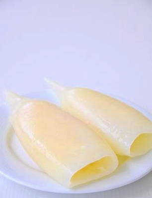 - Schil de inktviskarkassen en snijd ze in ringen van 1 centimeter breed.