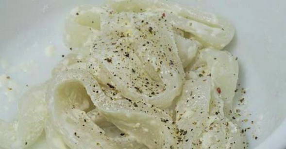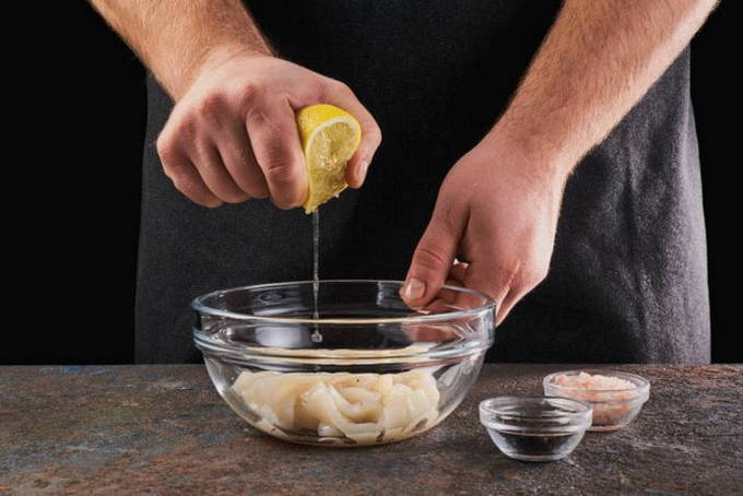 - Breng de ringen over in een kom, zout, breng op smaak en voeg citroensap toe, laat een half uur marineren.