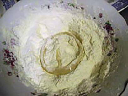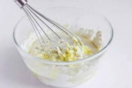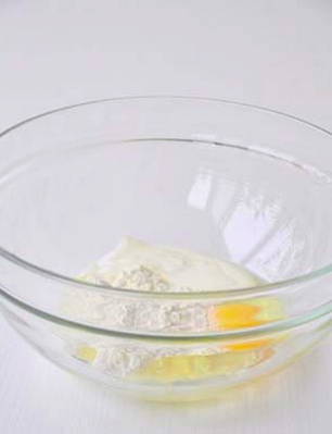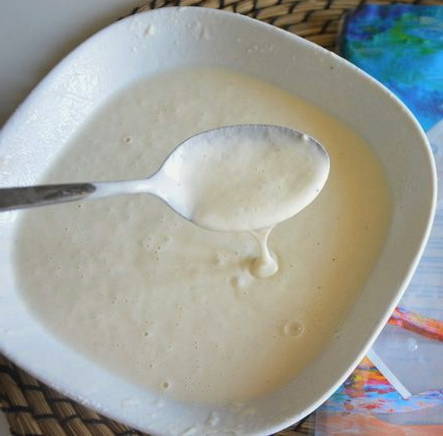 - Meng in een kom het ei, de bloem, de zure room, een eetlepel plantaardige olie, water en melk.