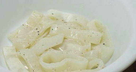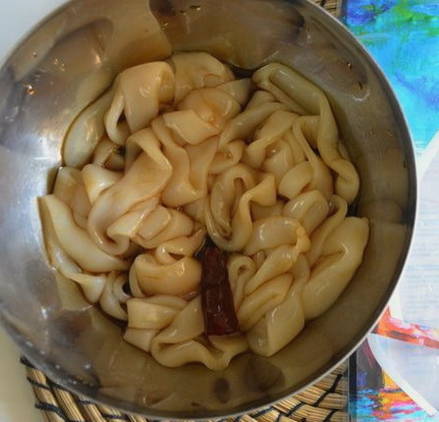 - Snijd de inktvis in ringen, doe ze in een kom, overgiet met sojasaus en voeg hete peper toe.