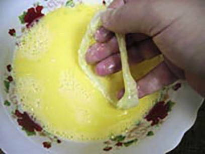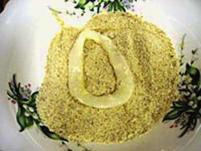 - Dompel elke ring eerst in bloem. Dip dan in een losgeklopt ei.