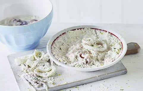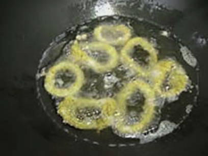 - Dompel de inktvisringen eerst in bloem en dan in beslag. Bak de ringen in een grote hoeveelheid plantaardige olie. Bak niet langer dan 2 minuten aan elke kant.