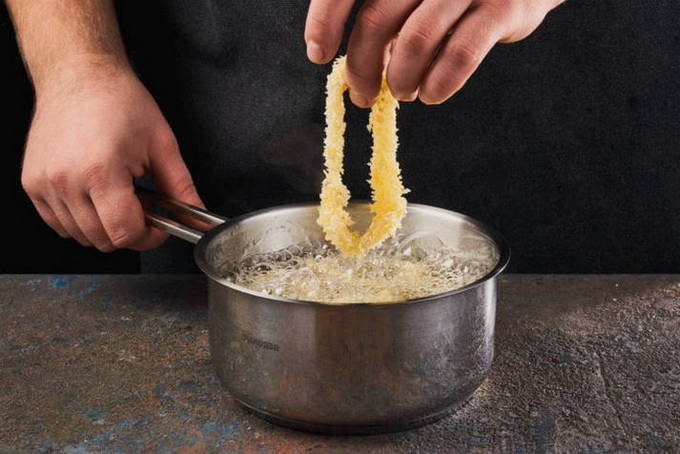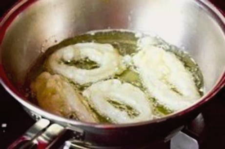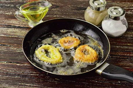 - Giet plantaardige olie in een pan of koekenpan. Dompel de inktvisringen in kokende olie en bak ze iets meer dan een minuut.