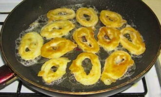 Verwarm een koekenpan voor, giet er plantaardige olie in. Dompel elke inktvisring in beslag en plaats in een koekenpan.
