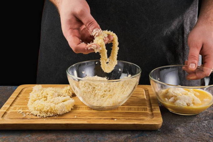 - Combineer de broodkruimels en de geraspte kaas op een apart schoteltje. Doop de inktvis in dit beslag en leg in hete plantaardige olie. Bak tot ze goudbruin zijn, 2 minuten aan elke kant.