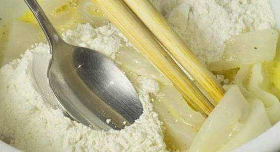 - Voeg bloem toe aan de inktvis en roer.