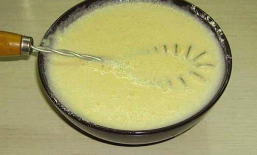 - Meng in een kom het ei, de bloem, de zure room, een eetlepel plantaardige olie, water en melk.