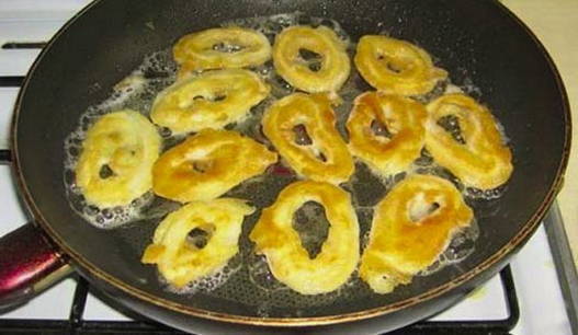 Verwarm een koekenpan voor, giet er plantaardige olie in. Dompel elke inktvisring in beslag en plaats in een koekenpan.