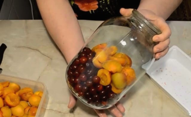 - Doe de voorbereide abrikozen en kersen in een gesteriliseerde pot van drie liter.